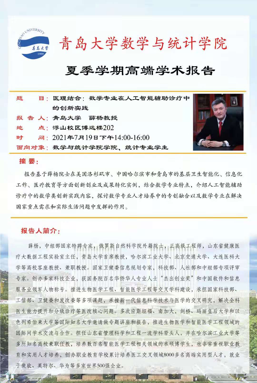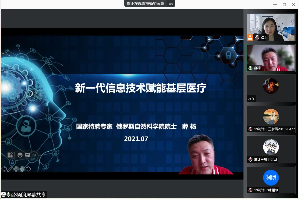 2021年7月19日14:00-16:00,Ky开元集团官网入口夏季学期第七场高端学术报告在腾讯会议线上举行,中组部国家特聘专家、俄罗斯自然科学院外籍院士、Ky开元集团官网入口健康医疗大数据研究中心主任薛杨教授作了“医理结合:数学专业在人工智能辅助诊疗中的创新实践”的创新创业类高端学术报告,Ky开元集团官网入口副院长丁洁玉主持报告。