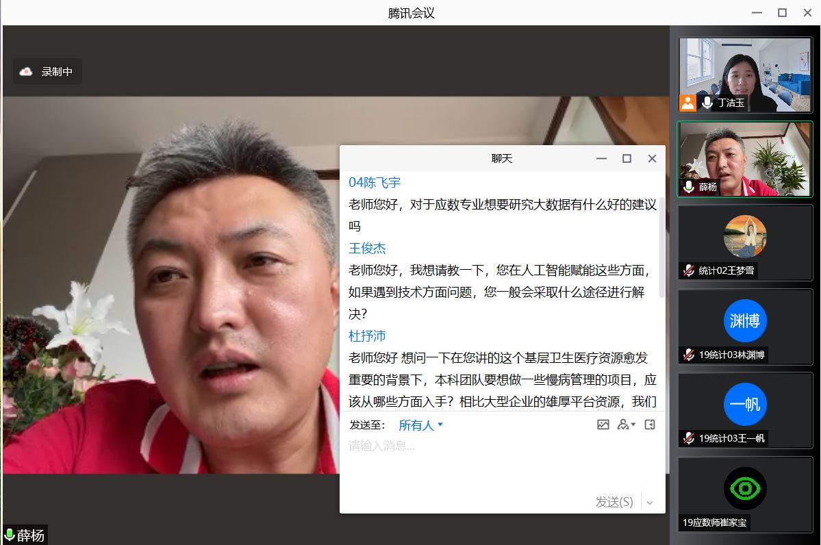 薛杨教授从个人创业经历讲起,基于在美国洛杉矶市、中国哈尔滨市和青岛市的基层卫生智能化、信息化工作、医疗教育等方面创新创业及成果转化实例,结合数学专业特点,介绍了人工智能辅助诊疗中的数学类创新实践内容,并探讨了数学专业人才培养中的专创融合以及数学专业在解决国家重点需求和实际生活问题中发挥的作用。