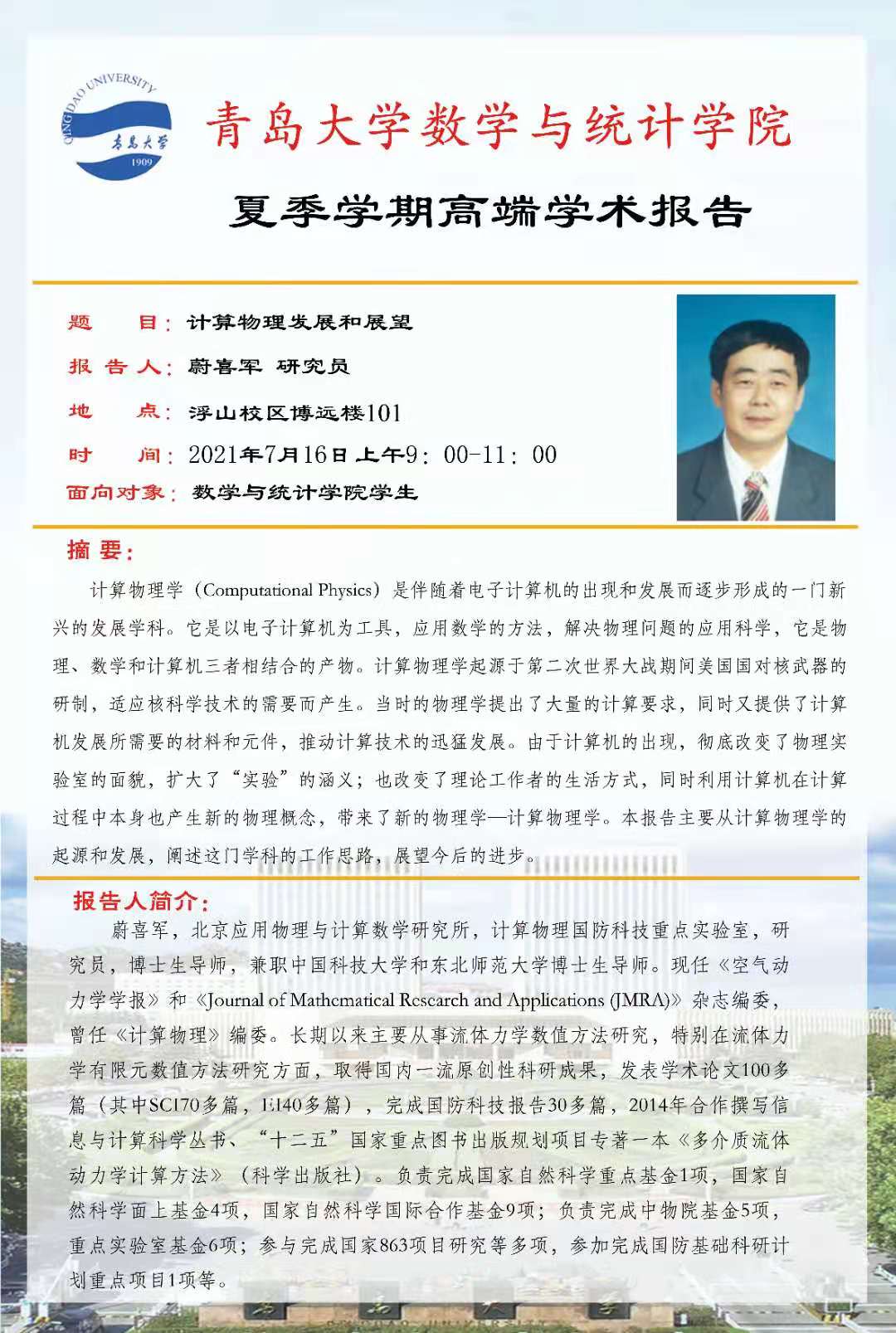 2021年7月16日9:00-11:00,Ky开元集团官网入口夏季学期第四场高端学术报告在博远楼101教室举行,来自北京应用物理与计算数学的蔚喜军研究员为Ky开元集团官网入口师生作了题为“计算物理发展和展望”的学术报告,介绍了计算物理的历史和未来的发展。