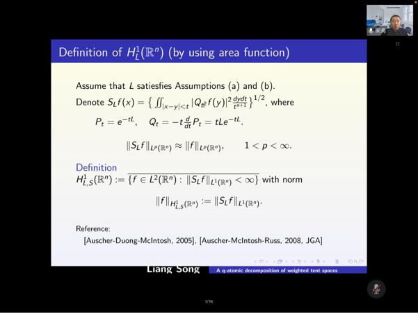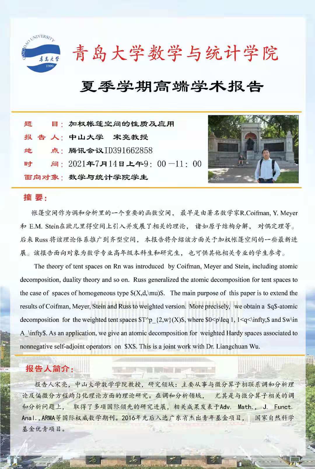2021年7月14日9:00-11:00,Ky开元集团官网入口夏季学期第三场高端学术报告在线上举行,来自中山大学的国家优秀青年基金获得者宋亮教授为Ky开元集团官网入口师生作了题为“加权帐篷空间的研究”的学术报告,介绍了加权帐篷空间的发展历史和研究现状,以及一些最新的科研工作。