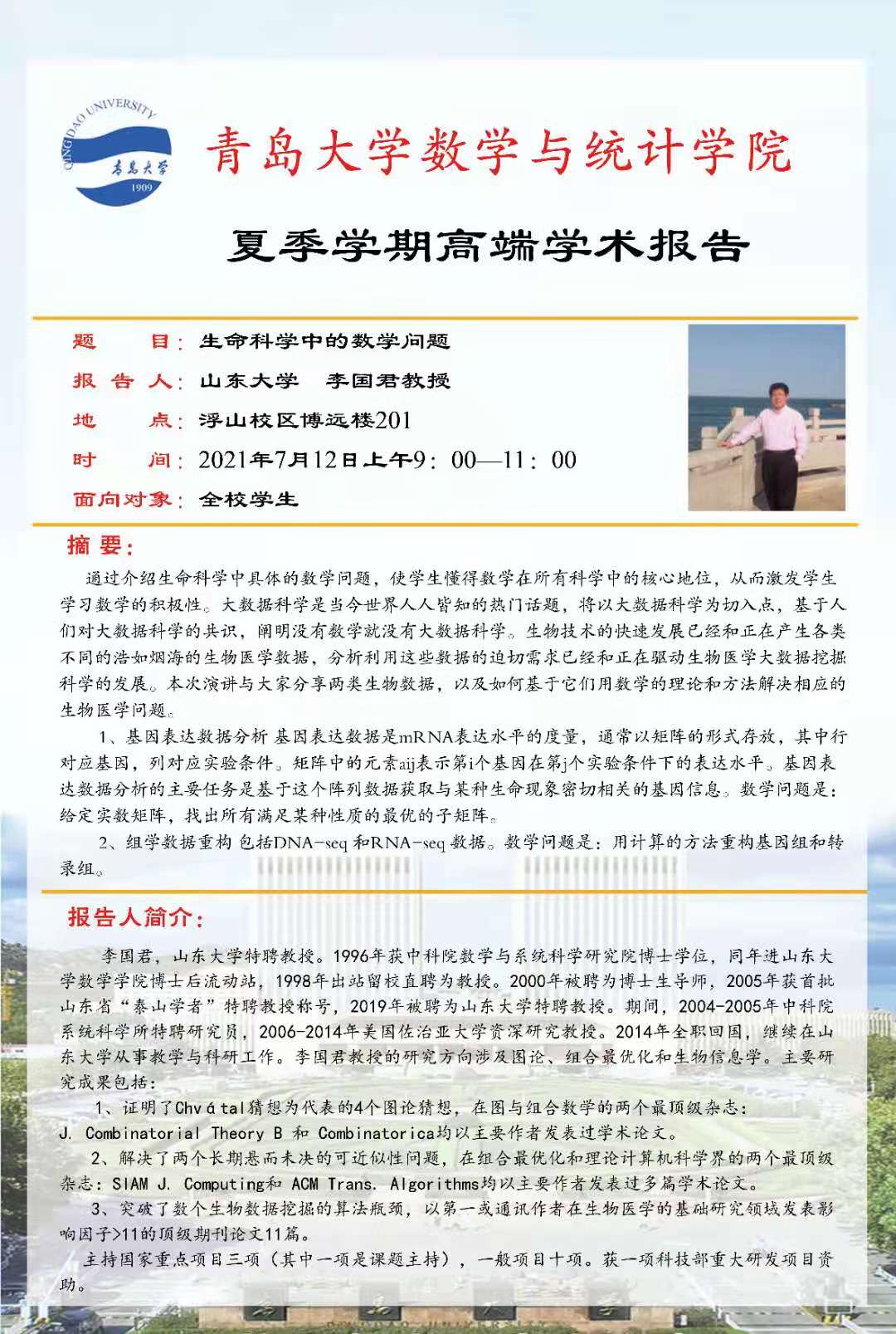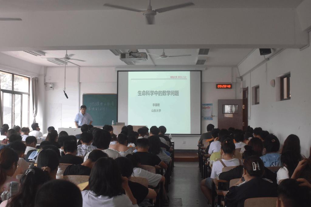 2021年7月12日9:10-11:50,Ky开元集团官网入口夏季学期第二场高端学术报告在博远楼201教室举行,来自山东大学的泰山学者李国君教授为Ky开元集团官网入口师生作了题为“生命科学中的数学问题”的学术报告,通过介绍生命科学中具体的数学问题,使学生懂得数学在所有科学中的核心地位,从而激发学生学习数学的积极性。