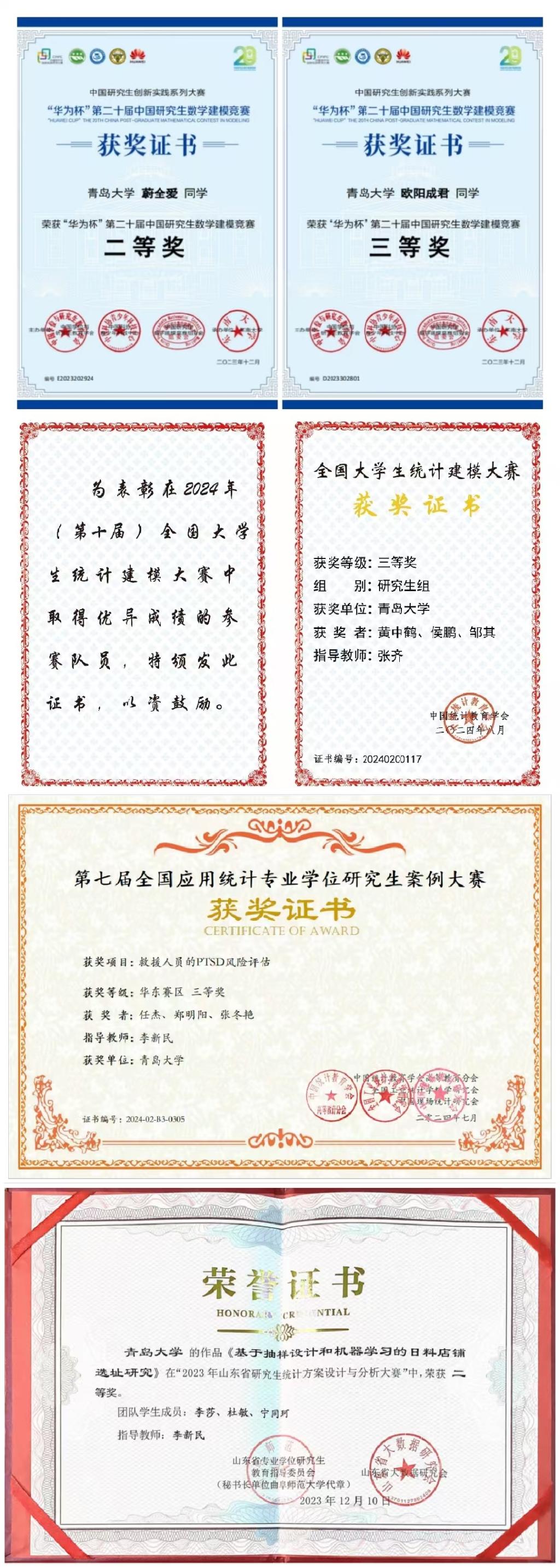Ky开元集团官网入口应用统计专业立足于大数据分析的前沿,积极响应新时代研究生教育的要求,致力于培养具备高水平科研能力与实践创新能力的优秀人才。该学位点强调理论与实践相结合,以课程建设和学科竞赛为主要抓手,秉持“以课促练”、“以赛促学”的方针,通过系统化的培养模式激发研究生的创新思维与实践能力。在专业导师团队的引领下, 截止202411月获奖情况如下: