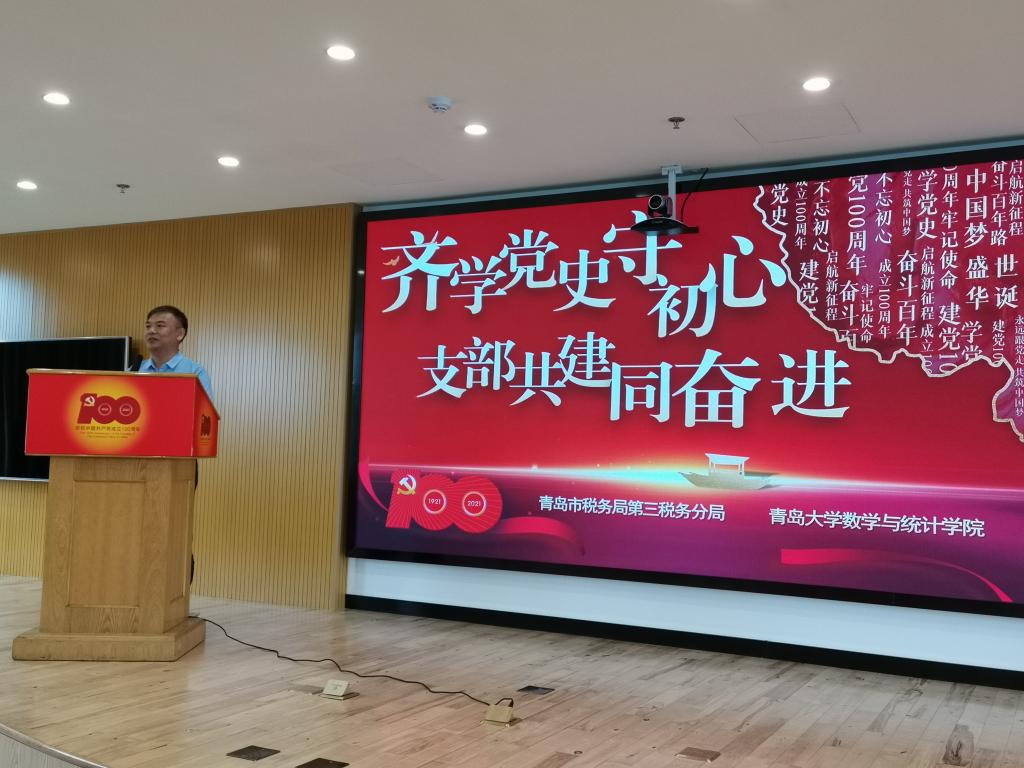 7月14日上午,数学与统计学院与青岛市税务局第三分局联合开展党建共建第二次活动。这是双方继此前签署党建共建协议之后的首次共建活动。学院党委书记姜永杰、副书记张雪蕾、学生党支部书记朱雨彤以及20名优秀学生代表共同参加此次共建活动。青岛市税务局第三分局局长王长江等领导同志热情接待。