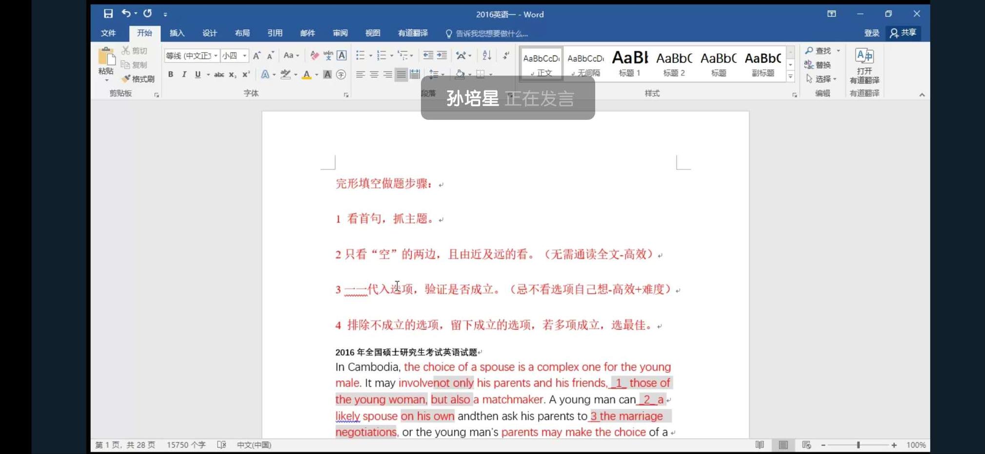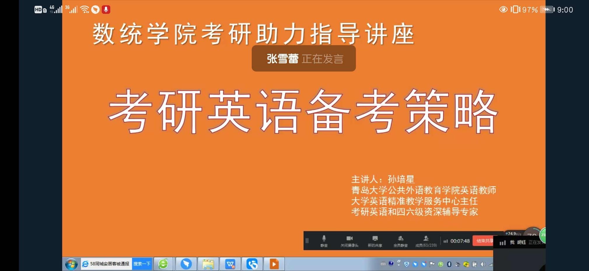 7月9日上午,Ky开元集团官网入口以钉钉线上视频的方式举办第一期“考研助力”主题讲座之考研英语备考策略讲座。公共外语教育学院大学英语精准教学服务中心主任、考研英语和四六级资深辅导专家孙培星老师主讲,2017级考研学生和部分备考六级的同学参加,讲座由学院党委副书记张雪蕾主持。