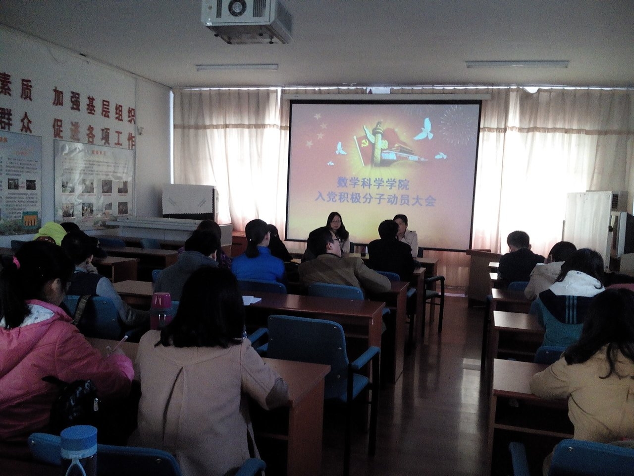 2014年4月9日中午12时40分,数学科学学院在励行楼302会议室召开了入党积极分子培训动员大会。主持本次会议的是团委副书记王彦,学院党委副书记张雪蕾出席了会议。大会开始,张书记对成为第四十期班学员的29名入党积极分子表示了衷心的祝贺,并要求大家端正入党动机、系统学习党的知识、真正做到从思想和行动上做到向党组织靠拢。希望大家以党课培训为契机,督促自身道德素养的发展建设,时刻以党员的标准严格要求自己,通过实际行动来表明自己入党的愿望,以良好的学习态度、生活作风和优秀的品质接受组织的考验,使自己早日达到党员的标准。