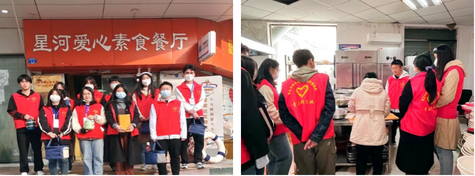 关爱无大小,温暖汇星河——星河素食爱心餐厅义工活动3月11日、1825,澎π部分成员前往星河素食爱心餐厅开展义工活动。志愿者们协助厨师烹饪食材装盛打包饭菜为附近社区老人们送去免费午餐帮助餐厅工作人员完成收拾碗筷清洁桌面等打扫工作同学们竭力为老人们提供温馨舒适的就餐体验获得了餐厅创始人刘阿姨以及受助老人们的一致好评