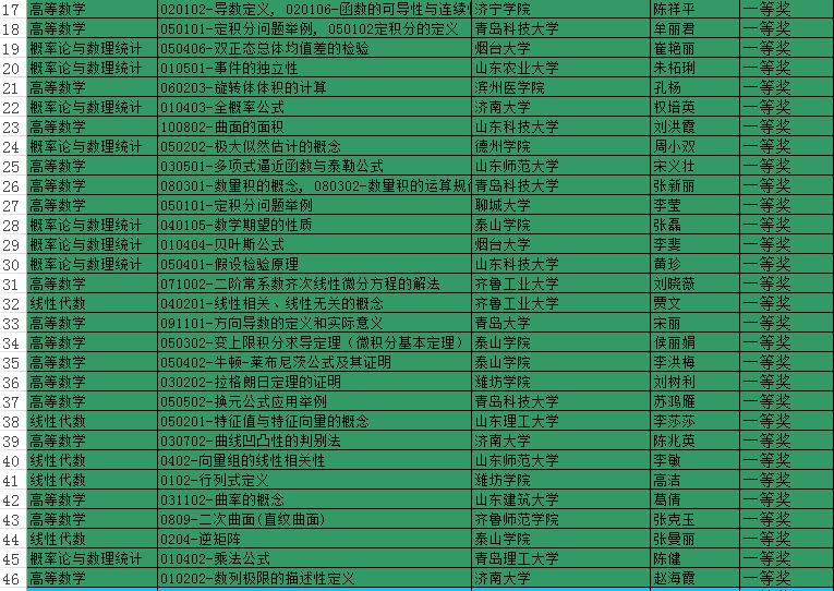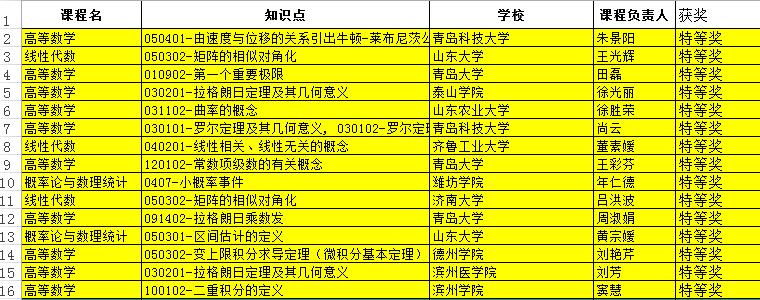 2015年7月7日,首届全国高校数学微课程教学设计竞赛山东分赛区评选结果揭晓。在全省27所本科院校的147名教师提交的比赛作品中,评选出了特等奖15项,一等奖30项,二等奖45项,其中特等奖将获推荐进入全国总决赛。
