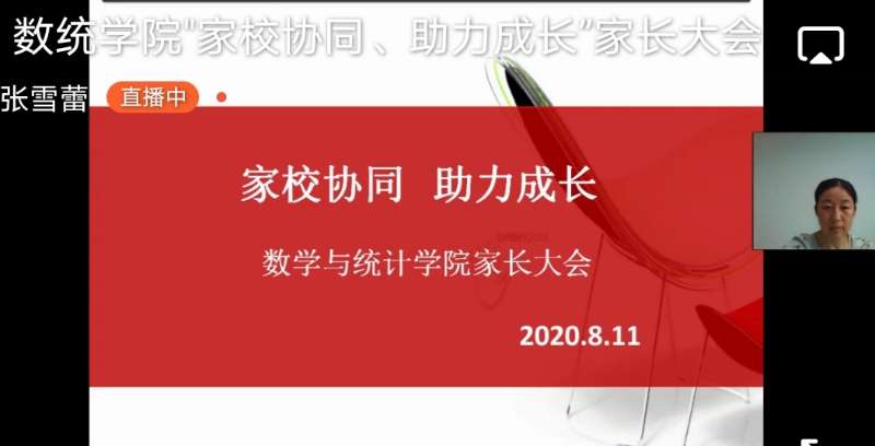 8月11日晚7:30,为实现全员育人、协同育人,数学与统计学院面向2017级、2018级、2019级三个年级本科生的家长们,以钉钉会议线上直播的方式召开“家校协同,助力成长”家长大会,2017级暑期在校学生的家长也通过单独的家长钉群联群参会。会议由学院党委书记姜永杰书记、院长高红伟主讲,党委副书记张雪蕾主持,学院班子全体成员及辅导员老师,以及约七百三十多名家长共同参加。