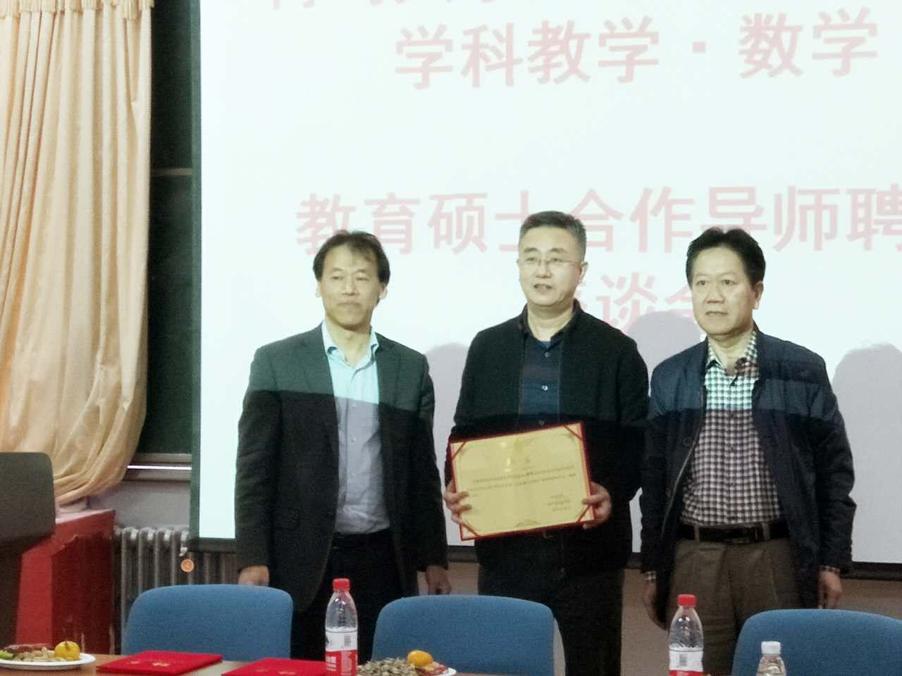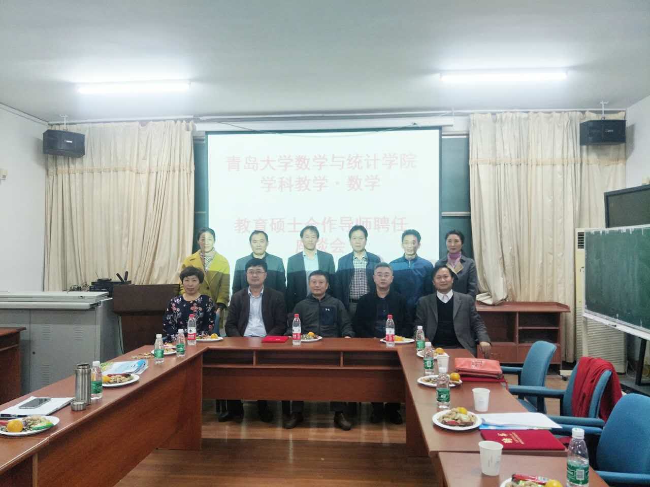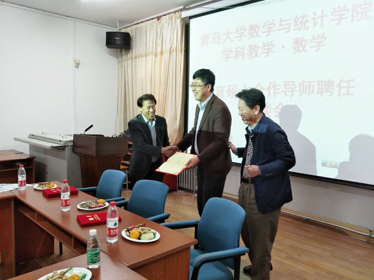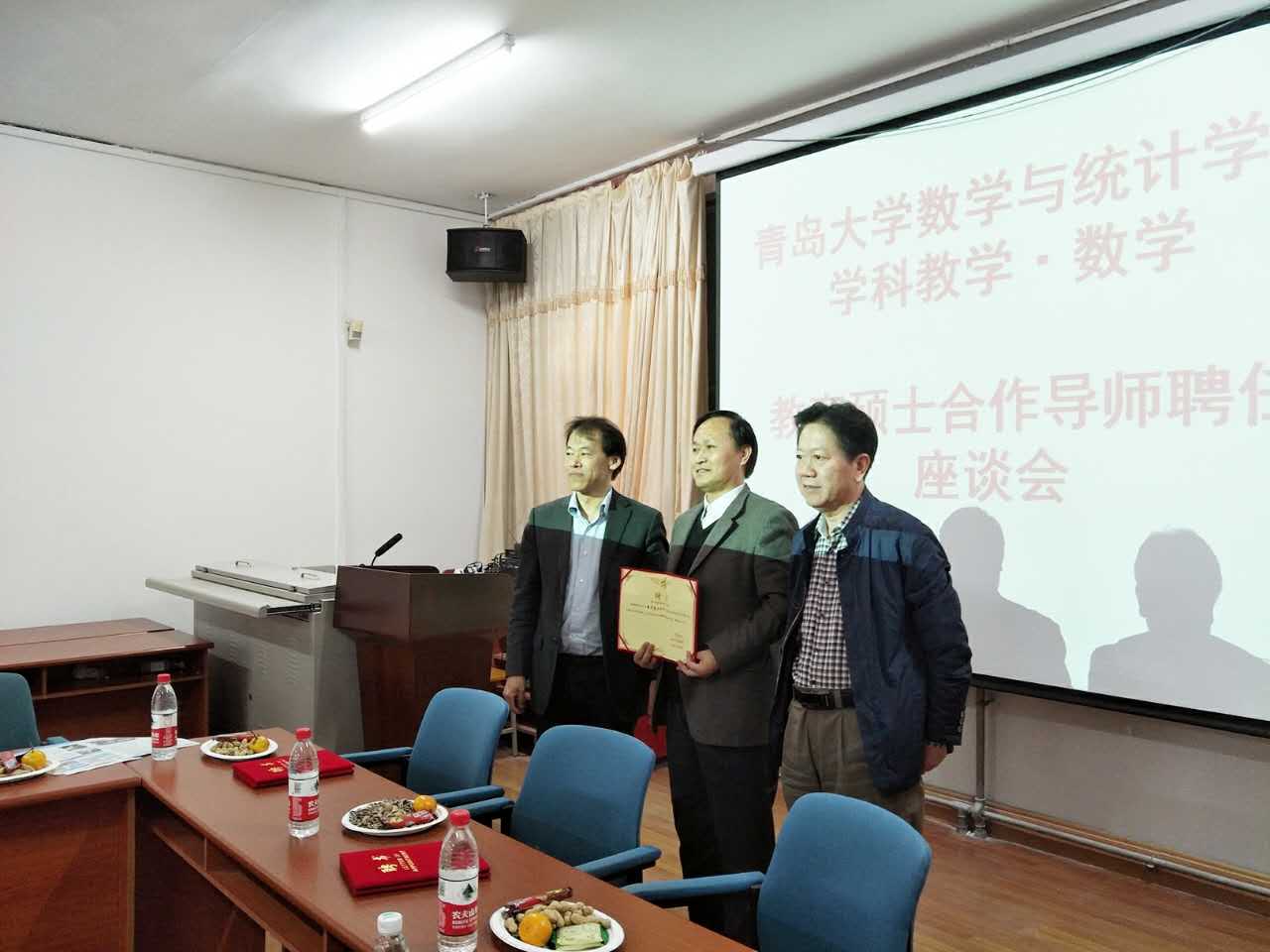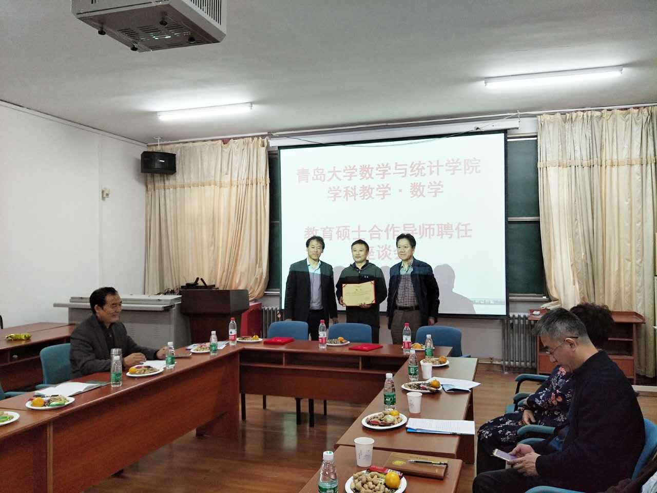 会议由李新民副院长主持,高红伟院长首先介绍了学院的基本情况和学科教学(数学)研究生的招生及培养情况,指出学校非常重视教育硕士专业学位研究生的培养工作,在培养方式上十分重视理论与实践相结合,实行双导师制,重视校外导师在教育硕士培养过程中的重要指导作用,校内外导师共同指导学生的学习和研究工作,同时也希望这些青岛中学数学教学的名师们为我们学院的师范生教育在实践技能教学等方面给予指导;会上这些校外导师们也结合当前中学的实际对我们的师范生培养提出了建议和希望,大家还对教师应具备的专业素养,职业道德,敬业精神等进行了深入交流。随后,陈学文书记和高红伟院长为6名校外导师颁发了聘任证书。