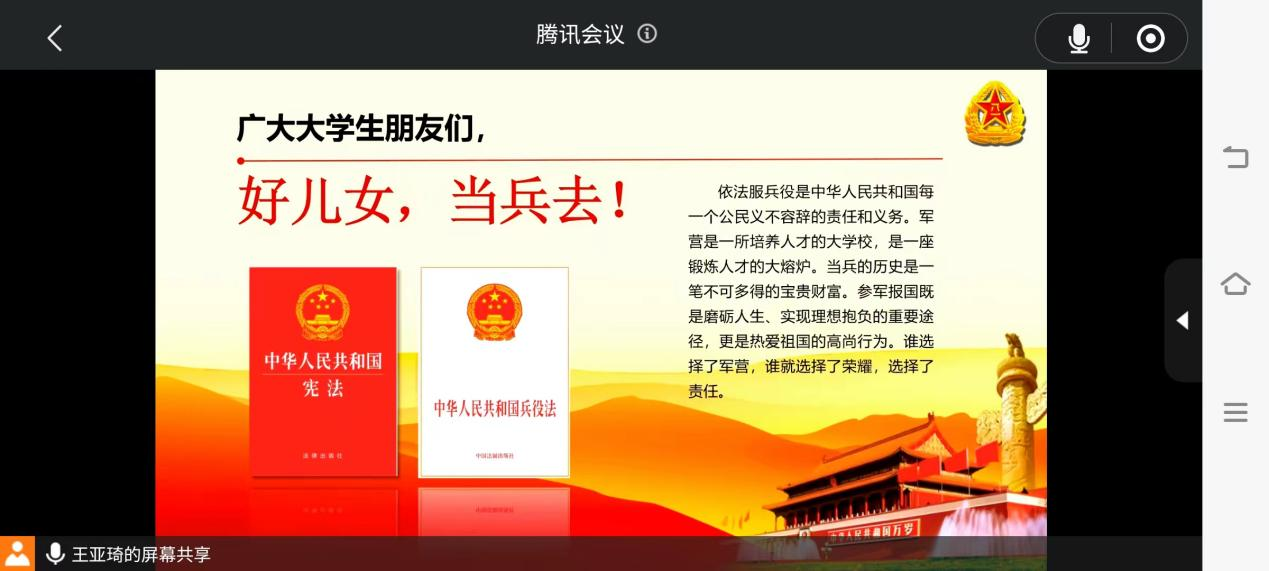 青春因磨砺而精彩,人生因奋斗而升华,为加强征兵政策宣传,进一步做好大学生参军入伍工作,1月9日20:00,Ky官网举办大学生征兵政策线上宣讲会,由院学生会武装部部长王亚琦主讲,学院有意向参军入伍的学生参加本次会议。