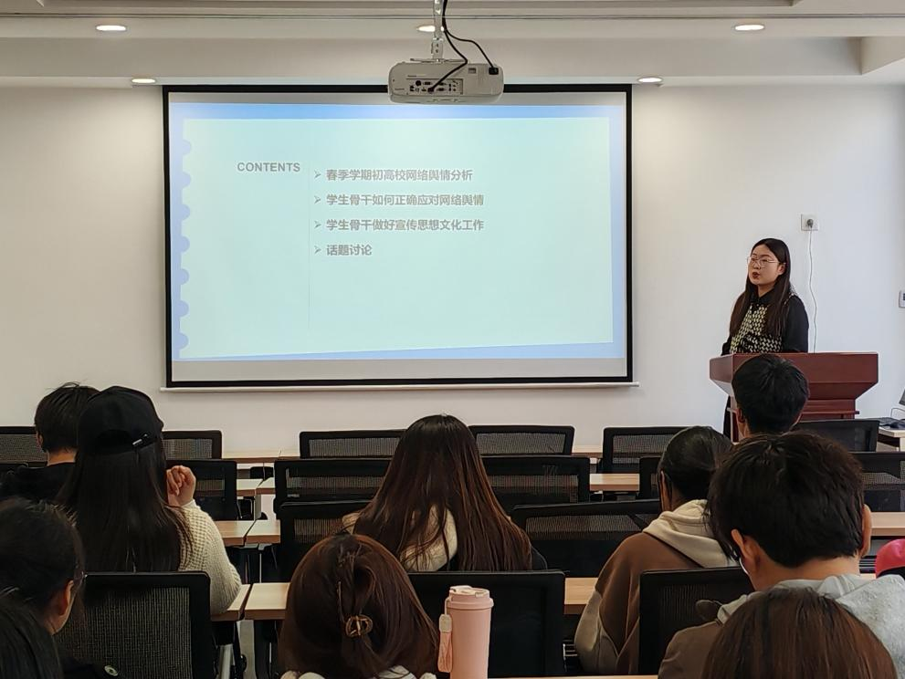 隋鹏蕾立足高校育人工作实际,系统解析春季学期网络舆情特点,从学生心理健康、就业实习压力到网络安全等热点问题进行深度剖析。她强调,学生骨干作为学院建设的中坚力量,需着力提升网络素养与信息甄别能力,建立“知行合一”的应急处置机制。在宣传工作维度,她鼓励同学们以热爱为原动力,创新运用新媒体技术,打造具有学院特色的文化传播品牌。